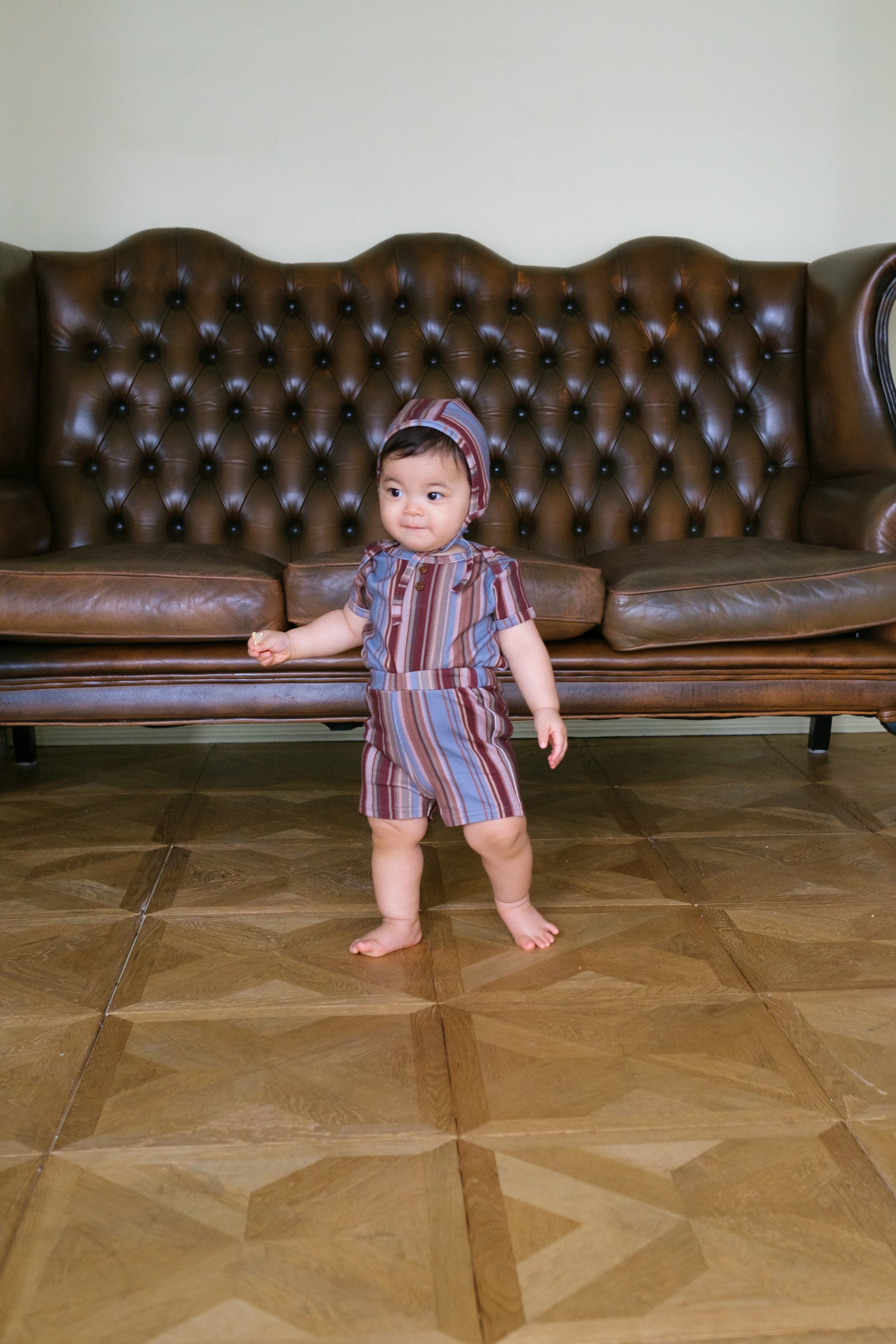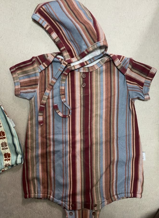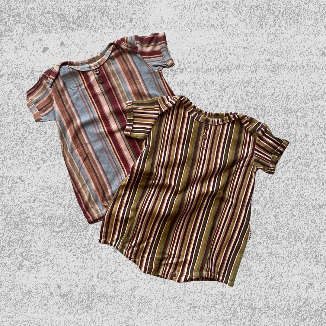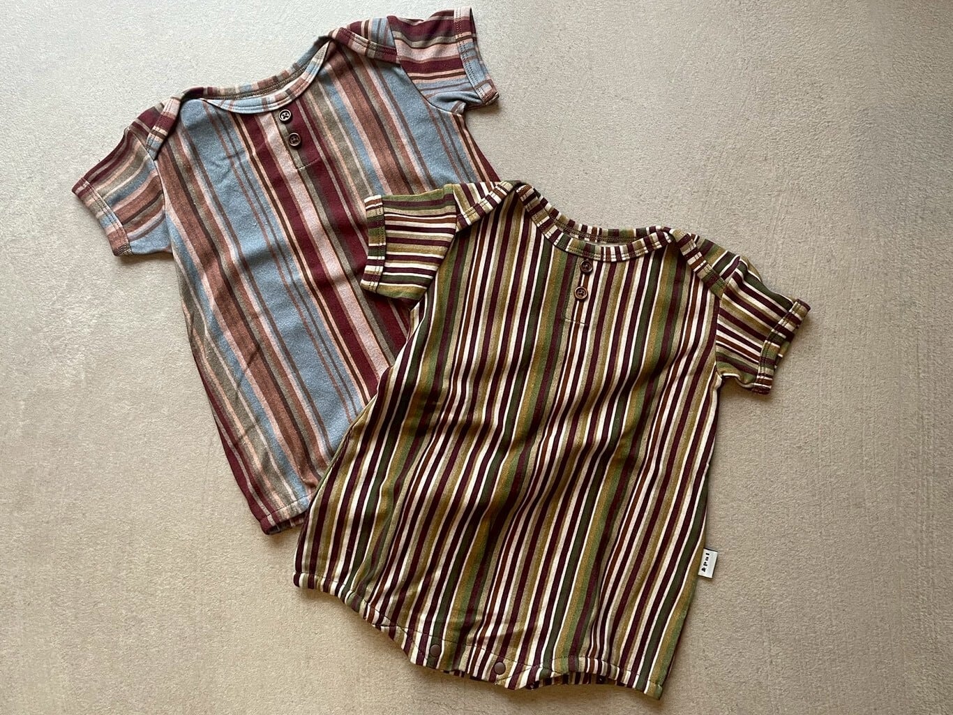 レトロ配色のストライプ柄が "&palらしい" ロンパース